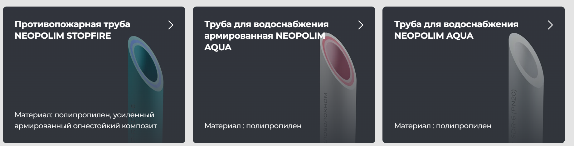 - NEOPOLIM AQUA — это трубы для водоснабжения, в том числе армированные стекловолокном. Они идеально подходят для систем отопления и горячего водоснабжения, так как устойчивы к линейному расширению и высокому давлению.